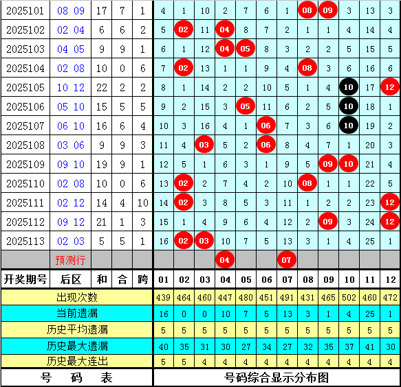 前区二号球尾数:该位上期开出尾数4为重复尾数,最近5期该位尾数升平降走势为:平→降→升→降→平,前10期尾数升平降比例为3:3:4,前30期尾数升降平比例为14:12:4,本期注意该位尾数上升,看好尾数5。