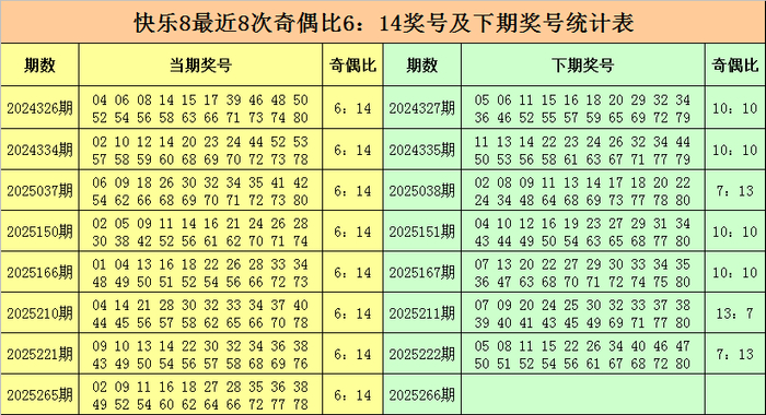 福彩快乐8第2025265期开奖回顾:02 09 11 16 18 27 28 35 36 38 49 52 54 60 62 64 66 72 77 78,其中奖号奇偶比为6:14,大小比为10:10,012路比为9:5:6。