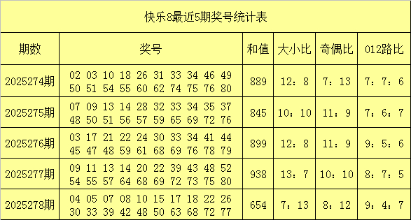 快乐8第2025278期奖号为:04 05 07 08 10 15 17 18 22 26 30 33 39 42 48 50 63 68 72 77,其中奖号012路比为9:4:7,跨度为73。