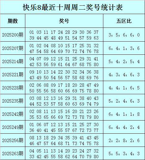 福彩快乐8第2025263期(上周二)开奖回顾:04 05 11 13 14 20 23 24 27 32 33 42 45 55 58 62 64 70 79 80,其中奖号五区比为5:5:3:4:3。