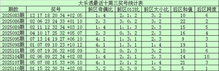 前区奇偶走势:上期前区奇偶比为2:3,上周三前区奇偶比3:2,最近十周三奇偶号码走势基本平衡,本期预计奇数号码转热,关注奇偶比3:2。