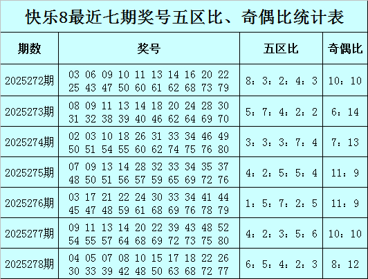福彩快乐8第2025278期开奖回顾:04 05 07 08 10 15 17 18 22 26 30 33 39 42 48 50 63 68 72 77,其中奖号五区比为6:5:4:2:3,奇偶比为8:12,012路比为9:4:7。